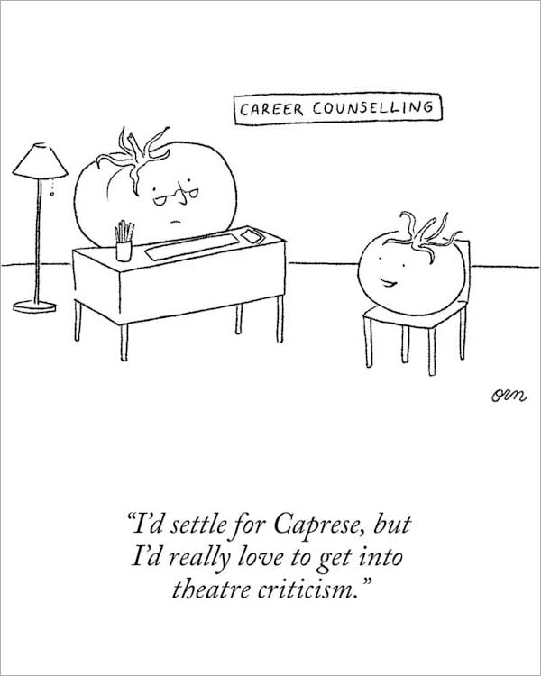 I stumbled across this very charming and witty cartoon from The New Yorker and couldn’t resist sharing. This tomato might be dreaming of theatre criticism—but I wonder if it’s heard of my career transition program, Re3? 😄 A little humor to remind us that exploring new paths is always worth it.